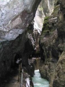 Затем, по рекомендации продавщицы в сувенирном магазине (она оказалась практически землячкой – из Пушкина), направились в ущелье Партнахкламм. Ущелье довольно интересное – узкая и глубокая расщелина с бурной горной рекой. Внизу вдоль реки в скале прорублена тропа для туристов. Нависающие над головой каменные глыбы и просачивающаяся сквозь стены вода навевали какие-то нехорошие мысли. После ущелья поехали через перевал в Австрию – в Иннсбрук. При спуске по длинному серпантину с уклоном в 18% мы остановились на одной из площадок, чтобы сфотографировать город сверху. При попытке переставить стоящий под уклоном мотоцикл, обнаружилось, что передний тормоз не работает – перегрелась тормозная жидкость. Пока мы ждали, когда остынет тормоз, на этой площадке останавливались легковые машины, у которых тормоза дымились. Для грузового транспорта на спуске предусмотрено очень много уловителей – экстренных выездов с дороги.